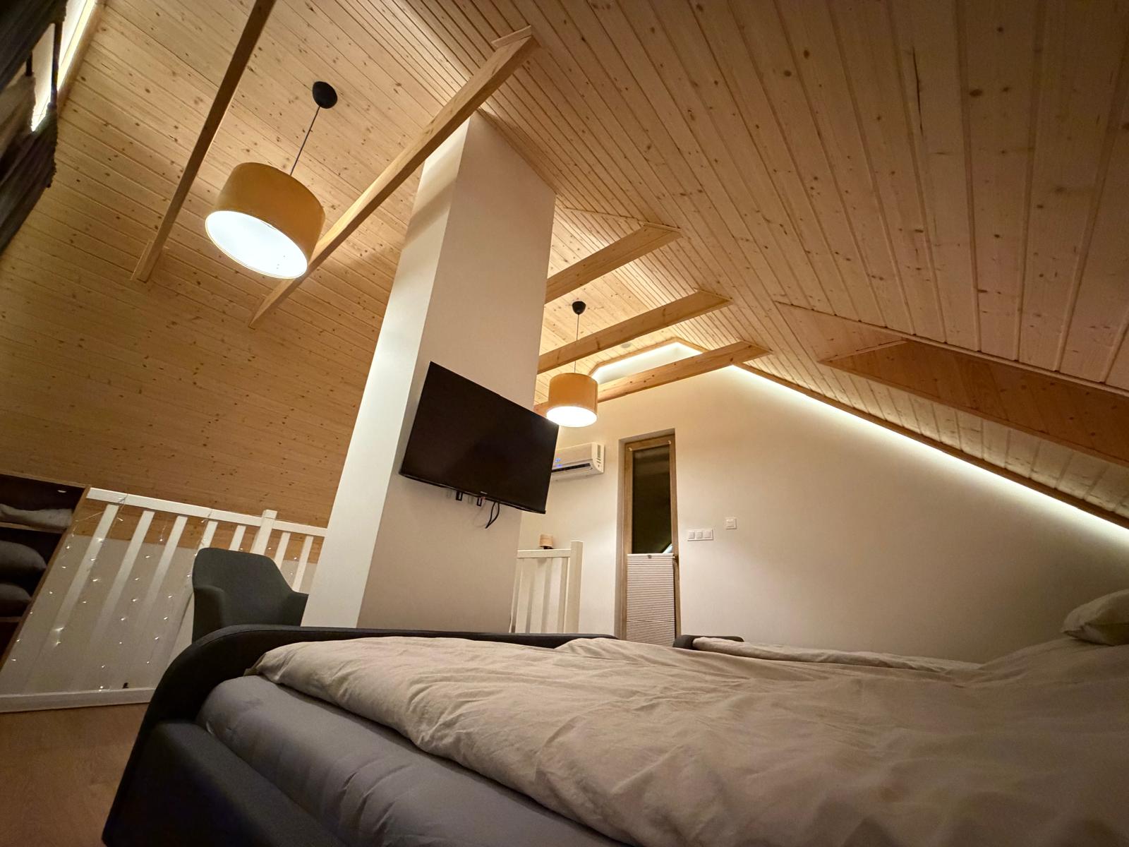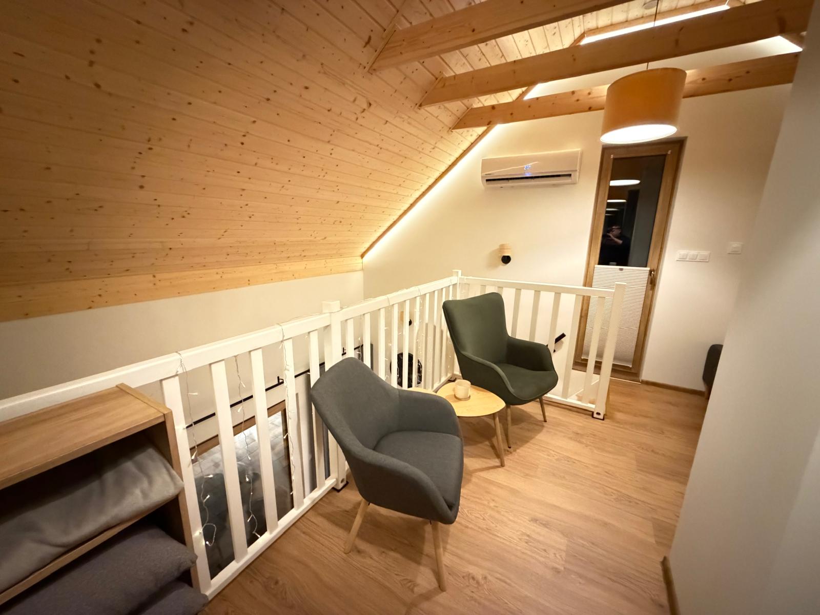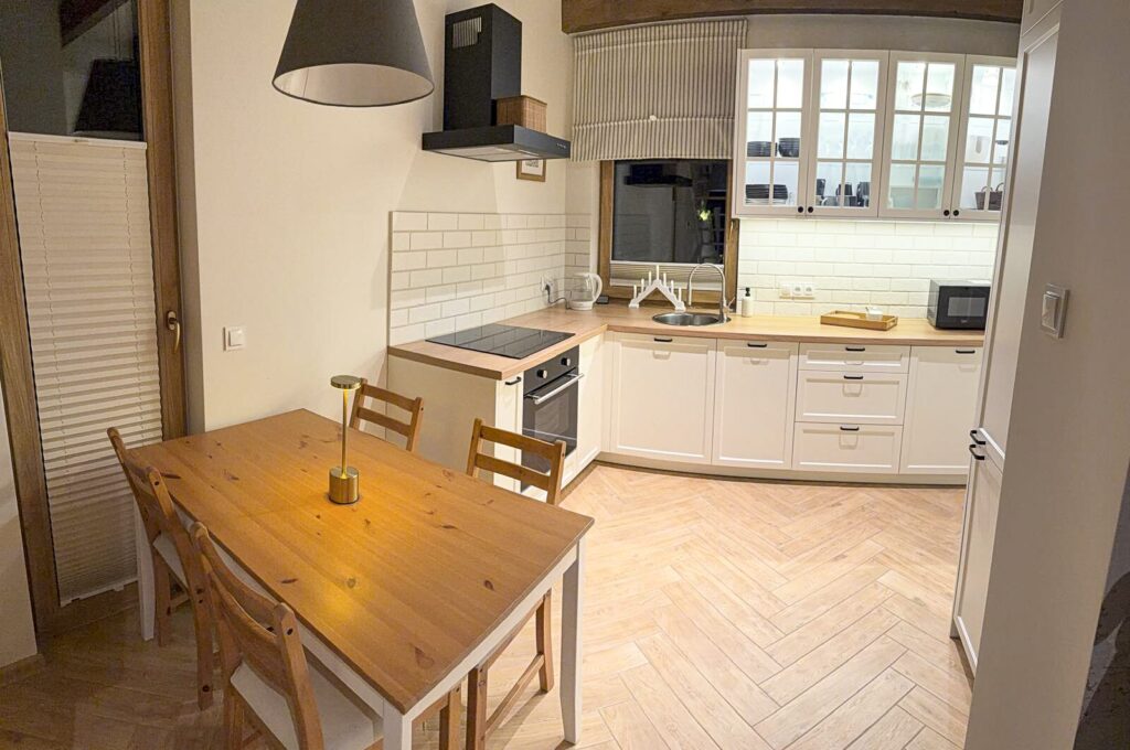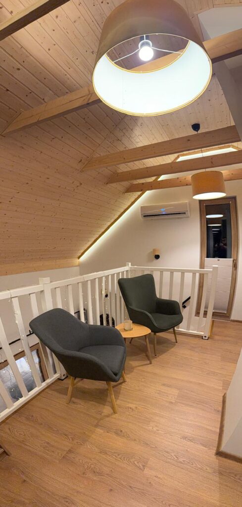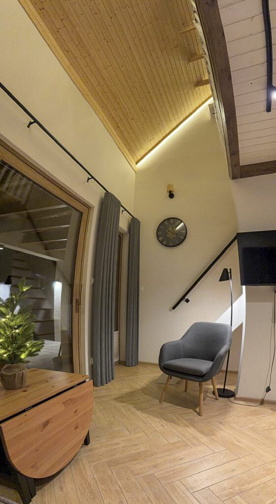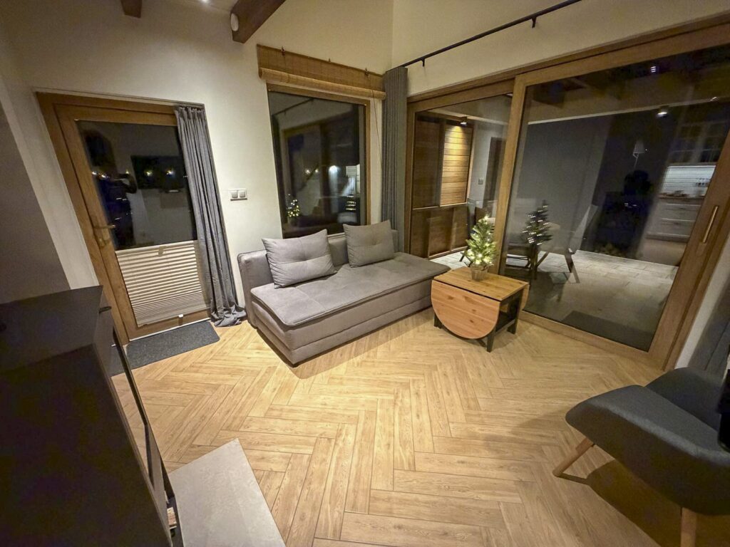 Zapraszamy do środka Domku Olchówka. Oferujemy przestronny salon z kominkiem, w pełni wyposażoną kuchnię z nowoczesnym sprzętem oraz przytulną antresolę. Każdy detal został zaprojektowany z myślą o Twoim wypoczynku – od ogrzewania podłogowego po klimatyzację.