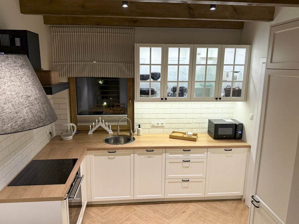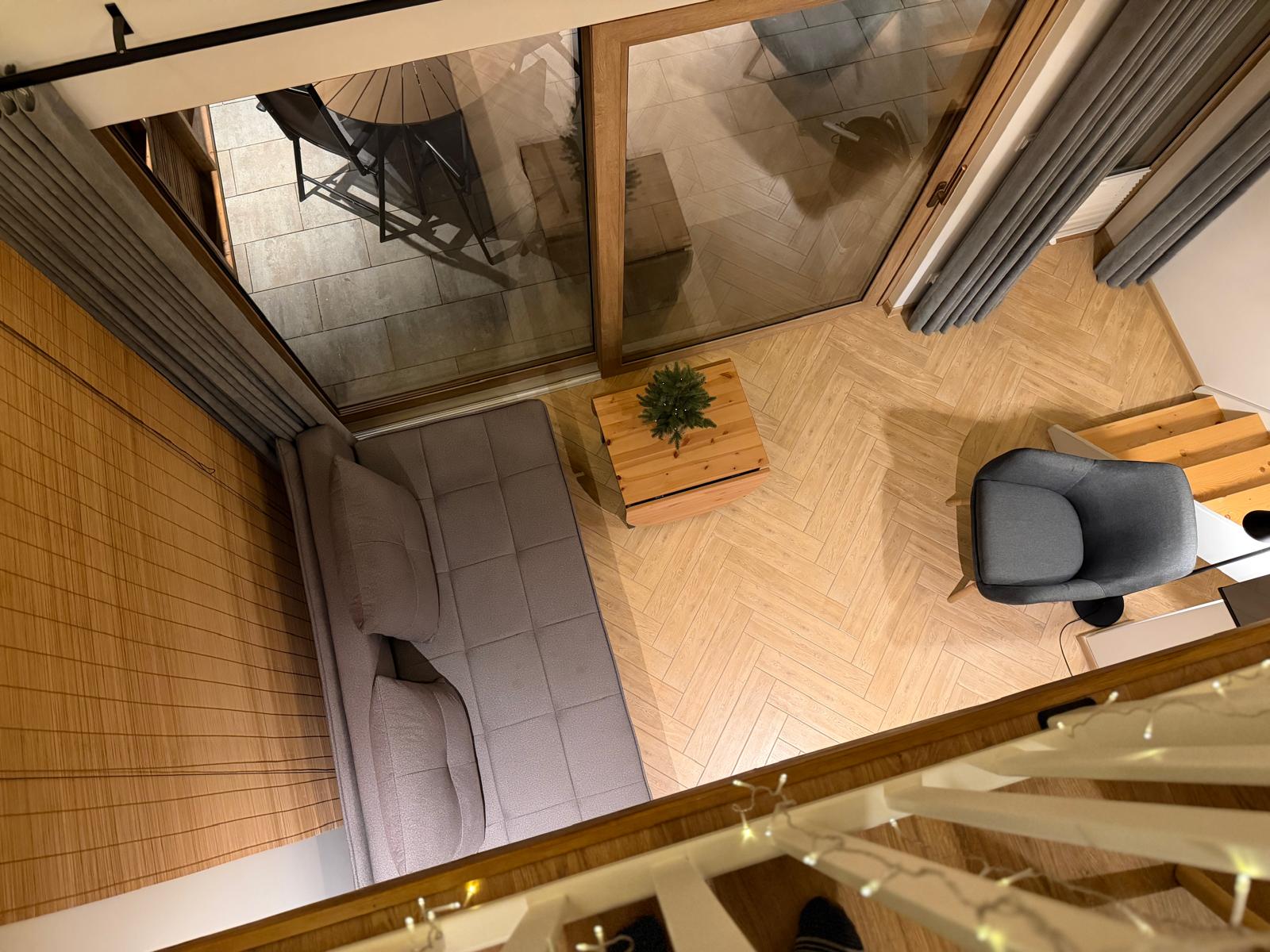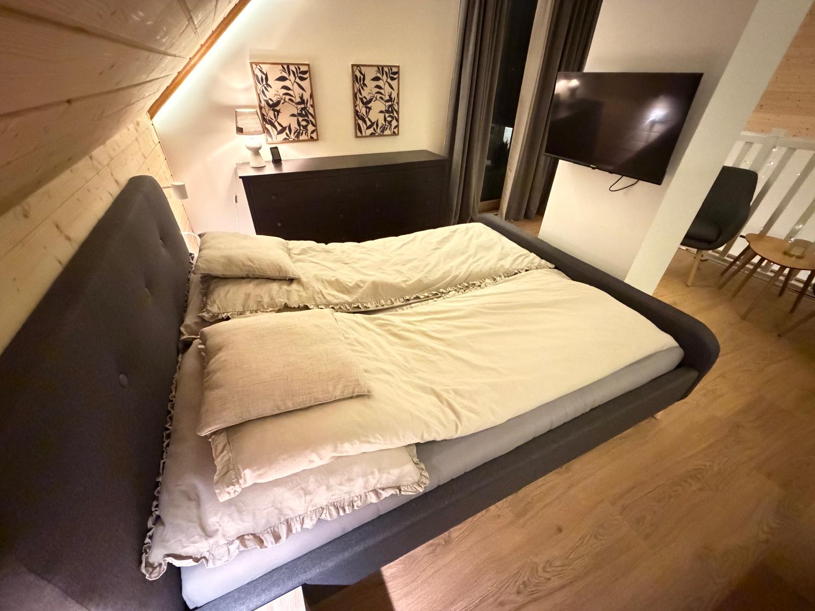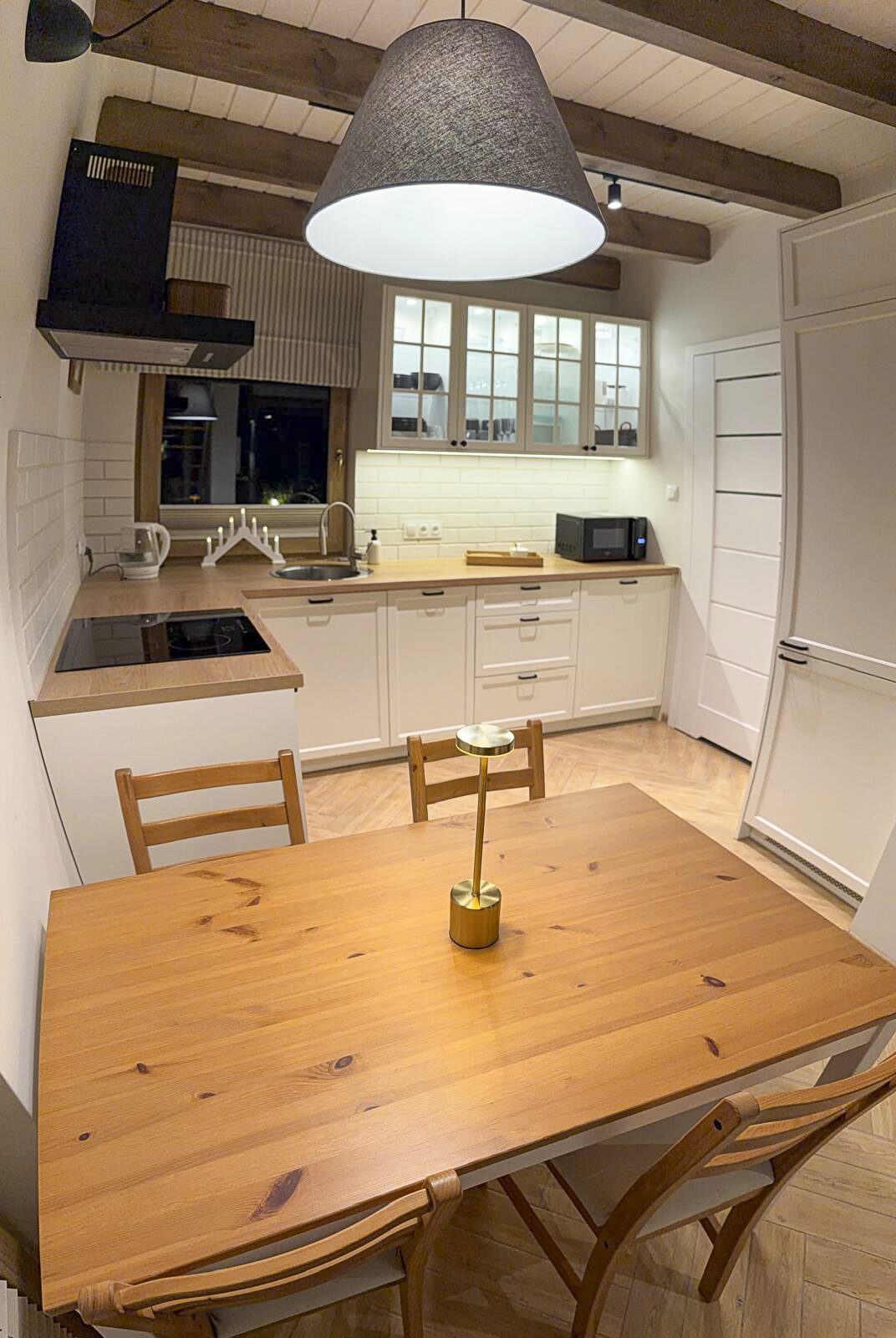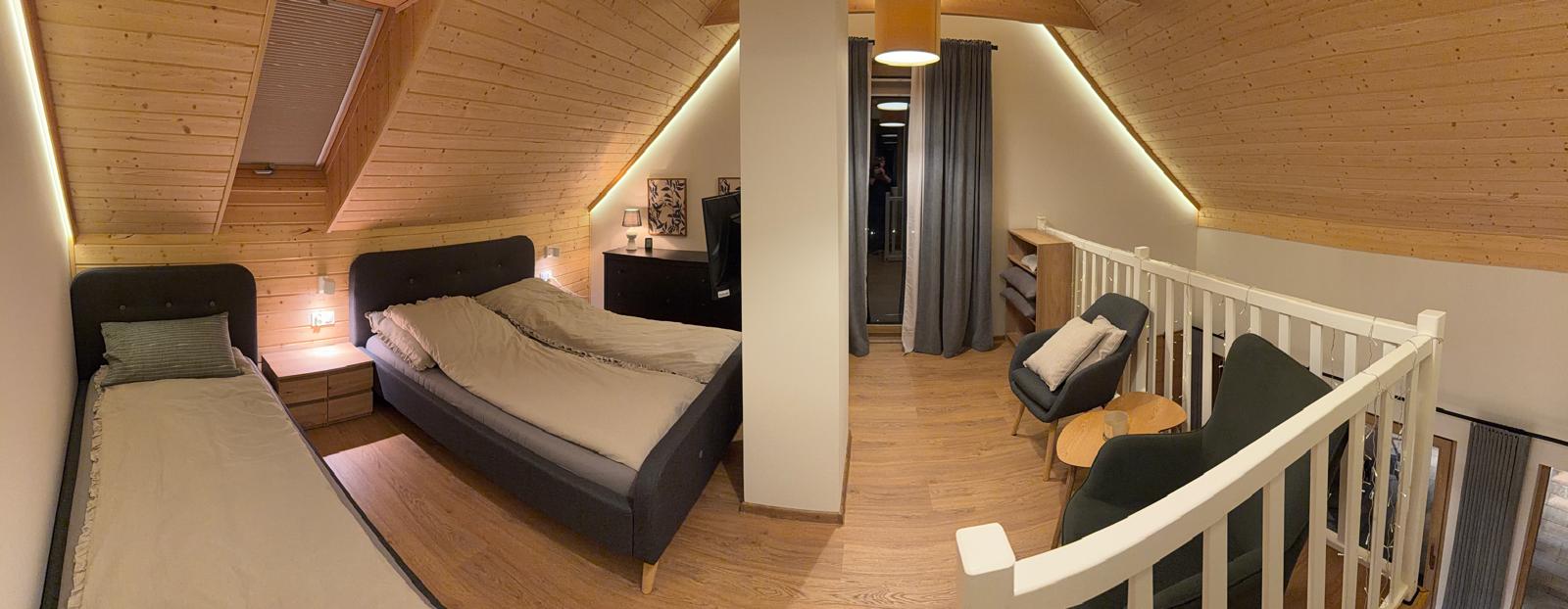 Zapraszamy do środka Domku Olchówka. Oferujemy przestronny salon z kominkiem, w pełni wyposażoną kuchnię z nowoczesnym sprzętem oraz przytulną antresolę. Każdy detal został zaprojektowany z myślą o Twoim wypoczynku – od ogrzewania podłogowego po klimatyzację.